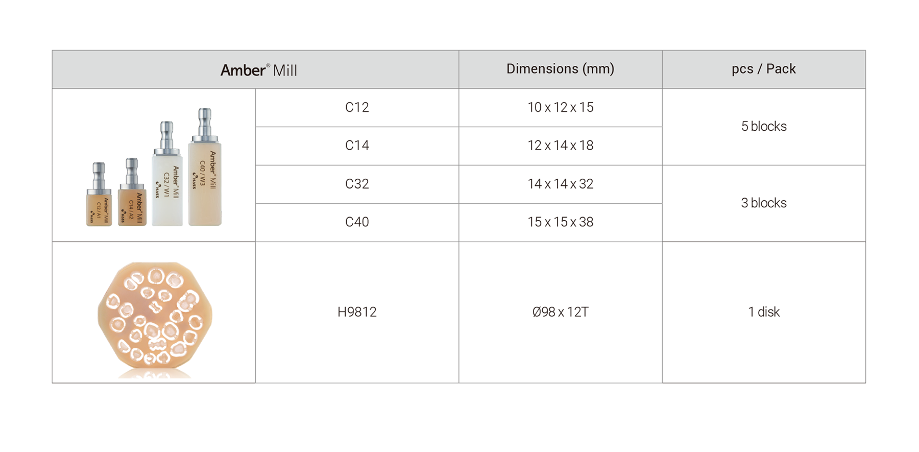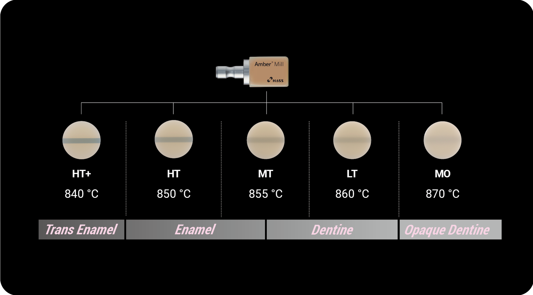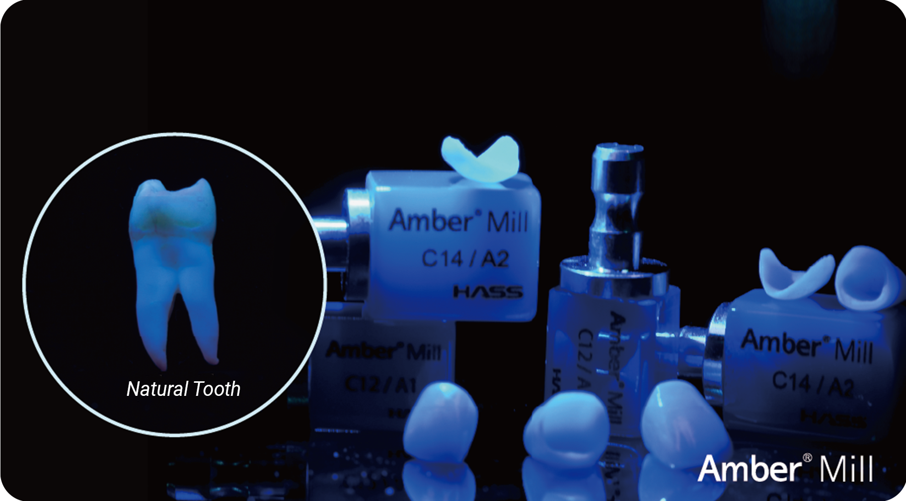 • Amber® Mill is engineered to closely replicate the natural translucency of enamel.