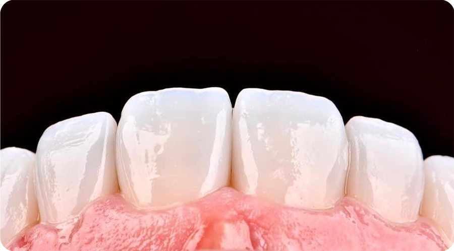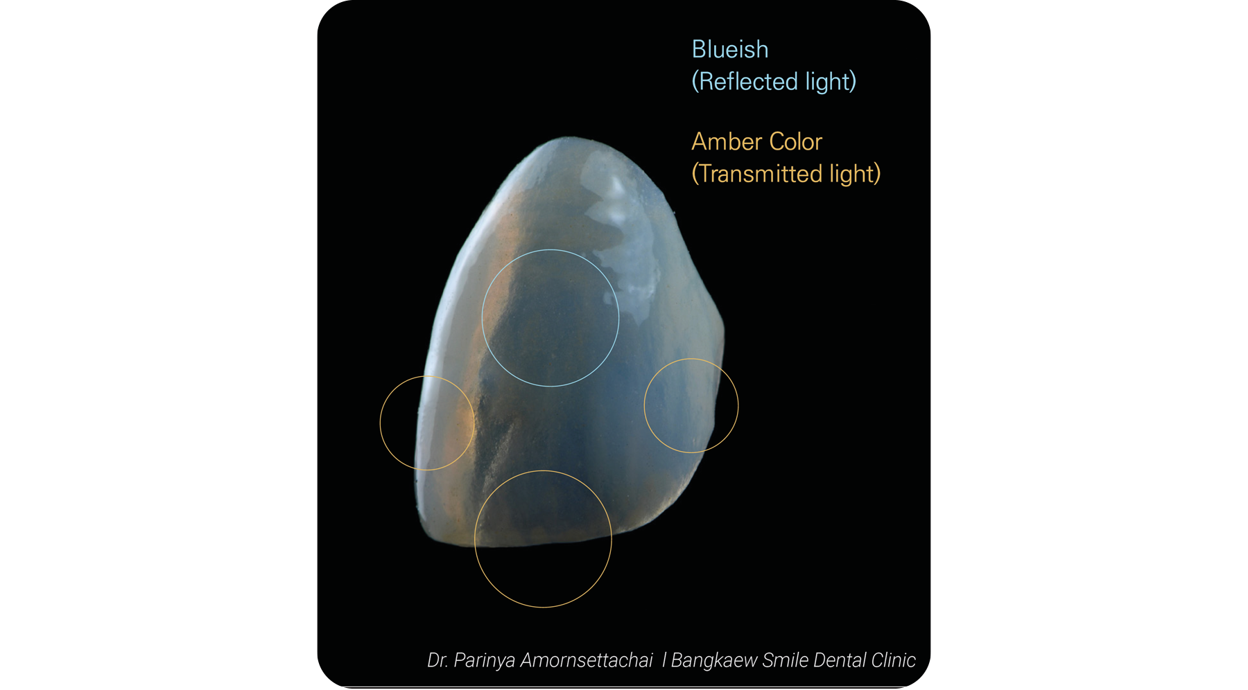 • Natural teeth covered by enamel exhibit characteristic translucency: they appear bluish under reflected light and amber under transmitted light.