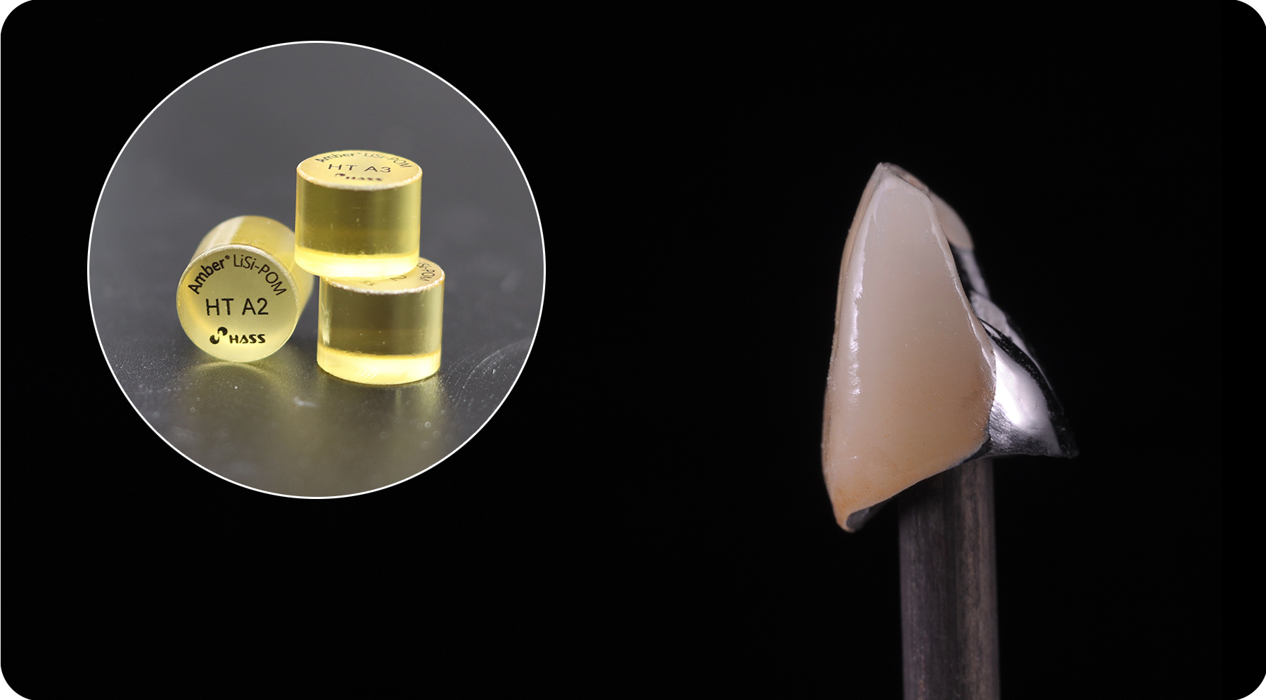 Amber Lisi-POM (LPM), Lithium-Silicate based glass ceramic ingot, is designed to be heat-pressed on metal frameworks.